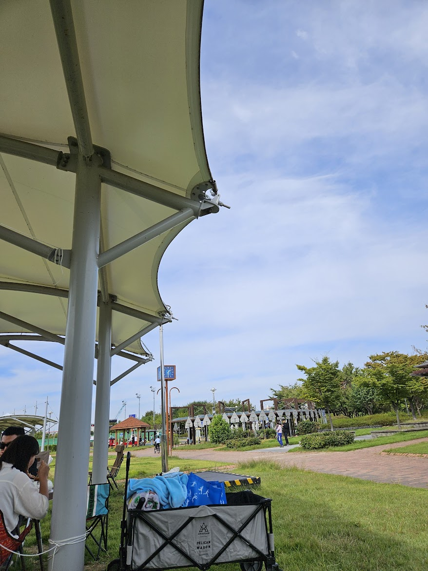 마루공원은 잔디밭 위에 그늘막도 잘 조성되어 있어서