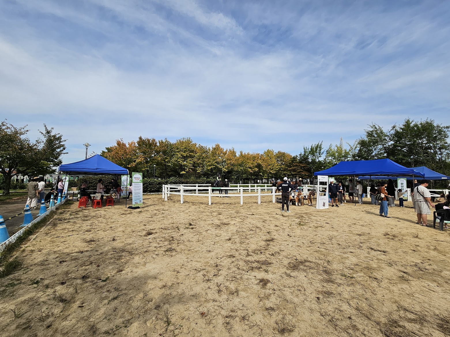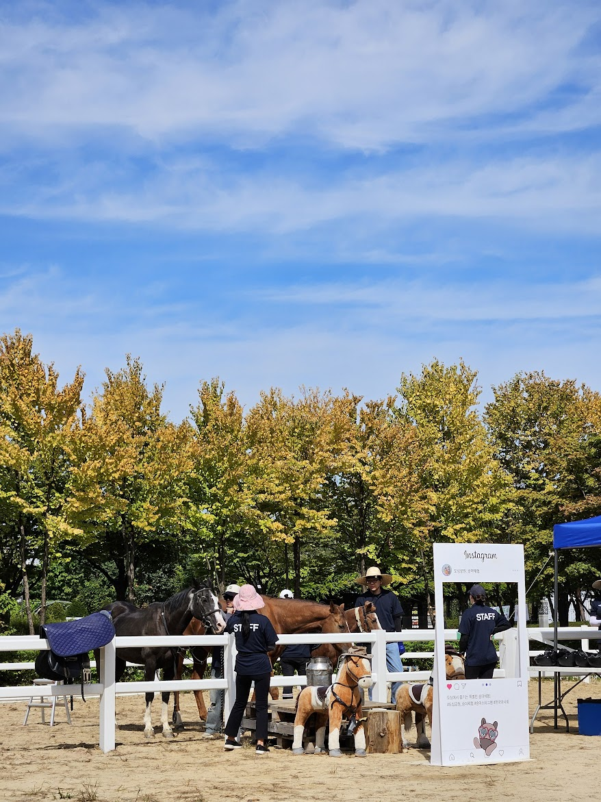 오른쪽에 보이는 천막에서 2차로 줄을 서고 흰색 펜스 있는 곳에서 승마 체험을 하는 방식이다.