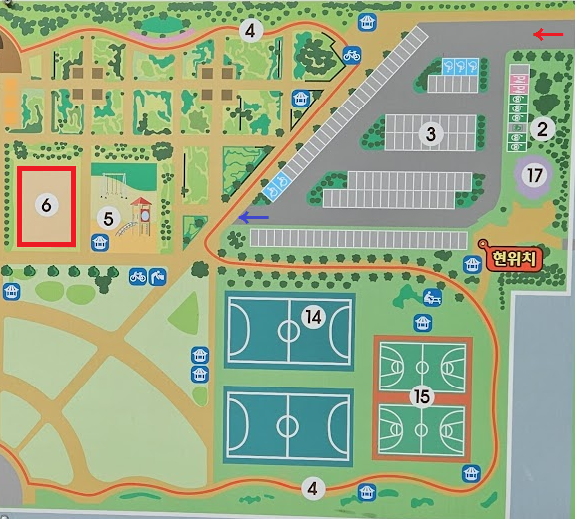 지도로 보자면 빨간 색 화살표 대로 주차장에 들어와 주차한 후 파란색 화살표 쪽으로 이동하면 5번 놀이터를 지나 6번 위치다.